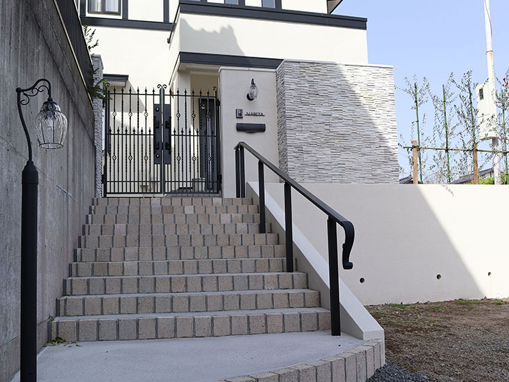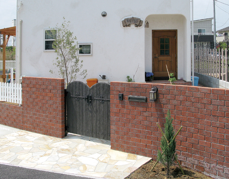 ブロックで作るゲートに、温かみと優しさを感じる門まわり