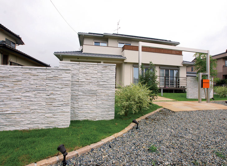 天然石の高級感とインパクトを感じる、ハイグレードな門まわり