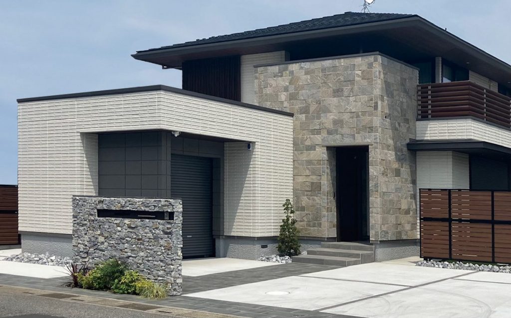 | 審査委員長 古橋宜昌様 より シンボリックな門袖壁が特徴的なエクステリアになっており、建物の外観ともマッチしています。エクステリアの袖壁というのは建物と比較してあまり大きな壁ではないので、そこに大判のタイルを貼ることもありますが、この様に小さなサイズの石を貼った方がバランス良く綺麗に見える良い事例になっていると思います。その壁に黒のアクセントラインが入り、表札やインターホンなどが組み込まれているので、スタイリッシュで現代風の良いアクセントになっていると思います。 |