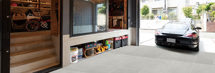 ZAUS Lifestyleプロデュースにより、建築家住宅と調和する舗装材を提案。 洗練されたカラーリングが、落ち着きのあるガレージ空間へと導きます。