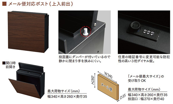 ポスト:スチール焼付塗装、ダイヤル錠、ダンパー付属、アルミ樹脂積層複合板、化粧塩ビフィルム